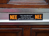 When Frank and I were walking to his car on Saturday, I asked him about these stickers that are on all of the mailbox slots in Amsterdam. Some say Nee and Nee in orange (see left) and some say Nee and Ja in both orange and green (see right). I couldn't figure out what these stickers were for.